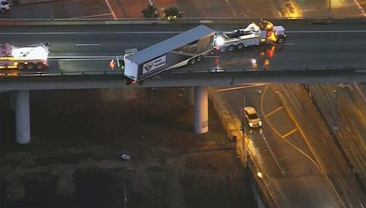 Big Rig Hangs Off The Side Of East La Freeway Overpass Nbc Los Angeles
